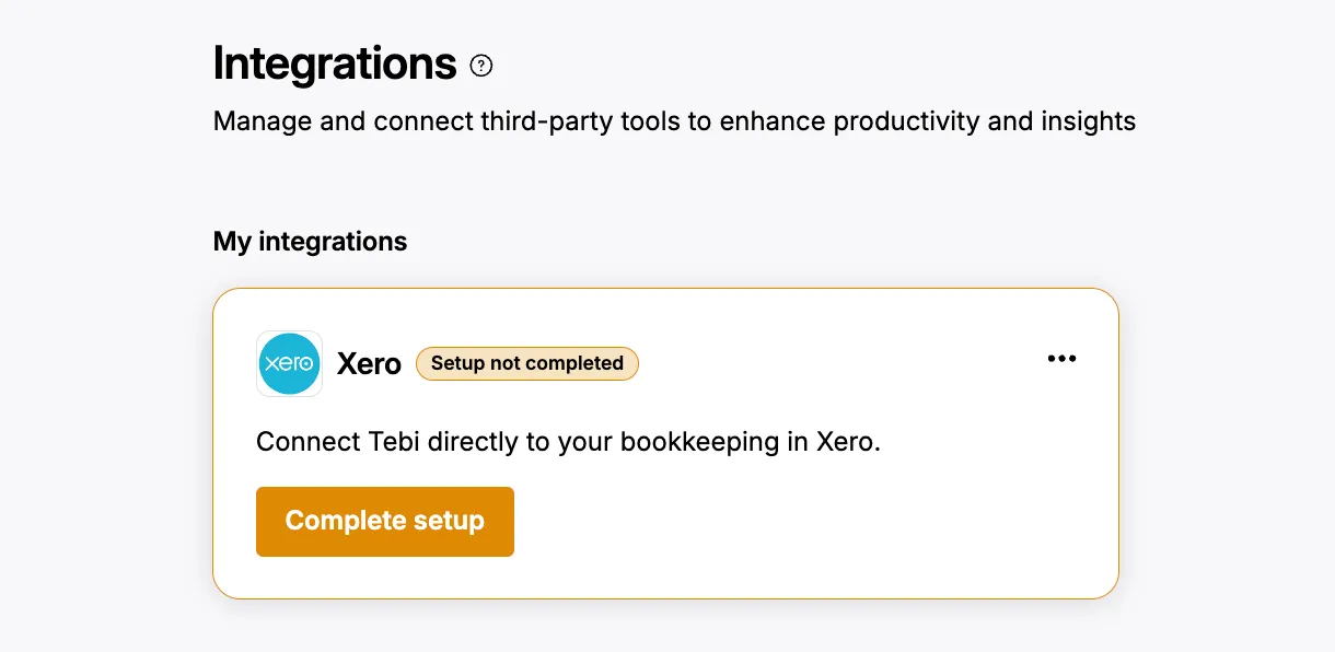 1. To map your accounts go to https://live.tebi.co/backoffice → Go to the ‘Integrations’ tab → navigate to the Xero box and click on ‘Complete Setup’.