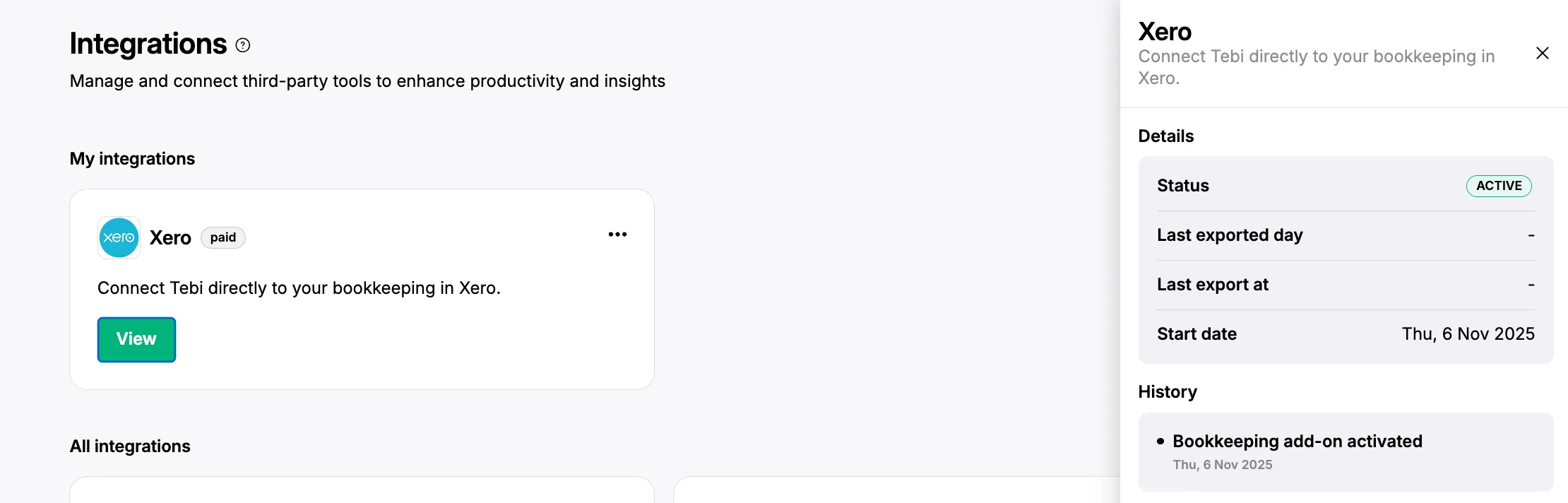 After the integration: You can go to the integrations tab, navigate to the Xero integration, click on view. A side window will open where you can see the status is “ACTIVE”.