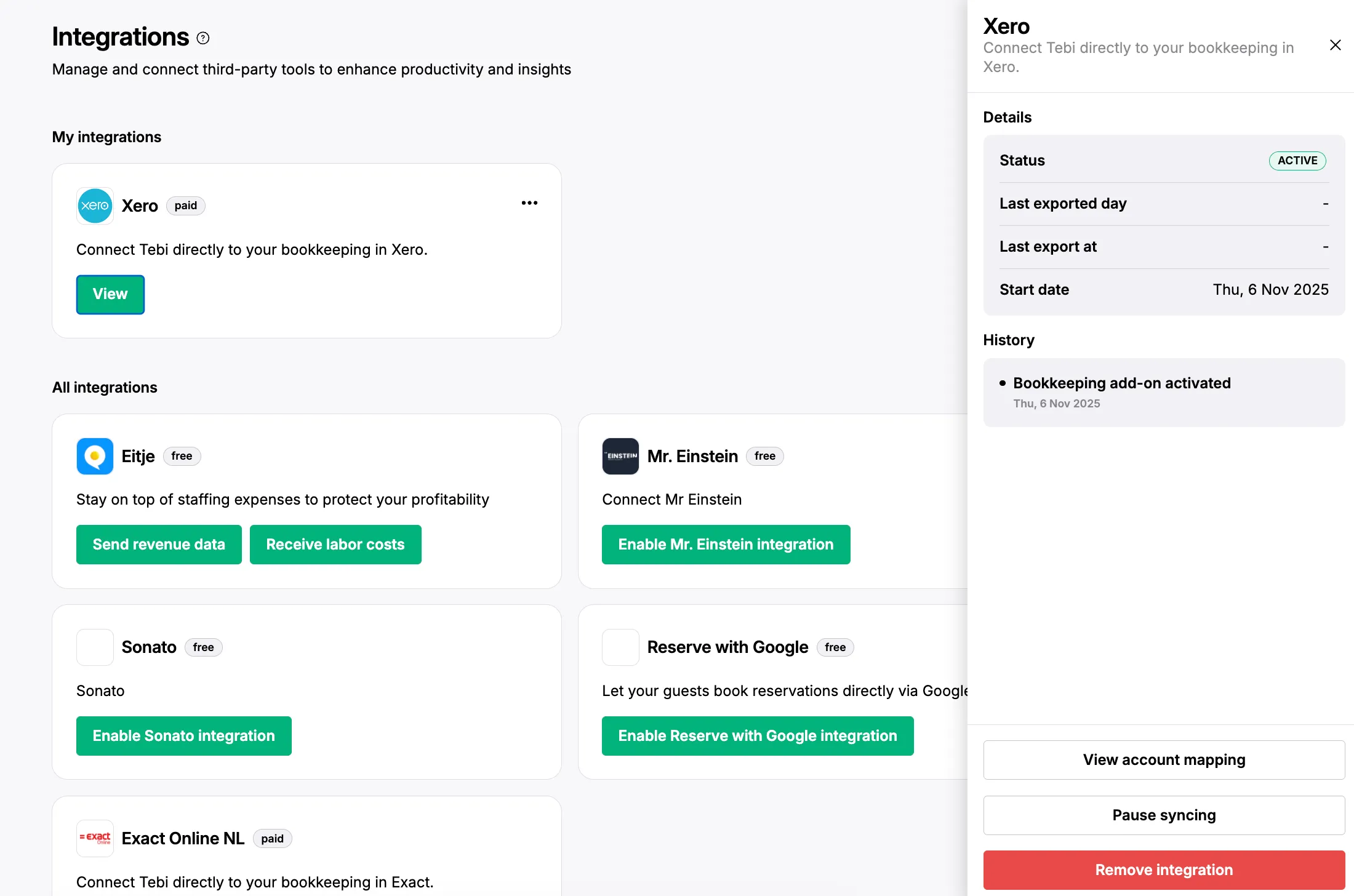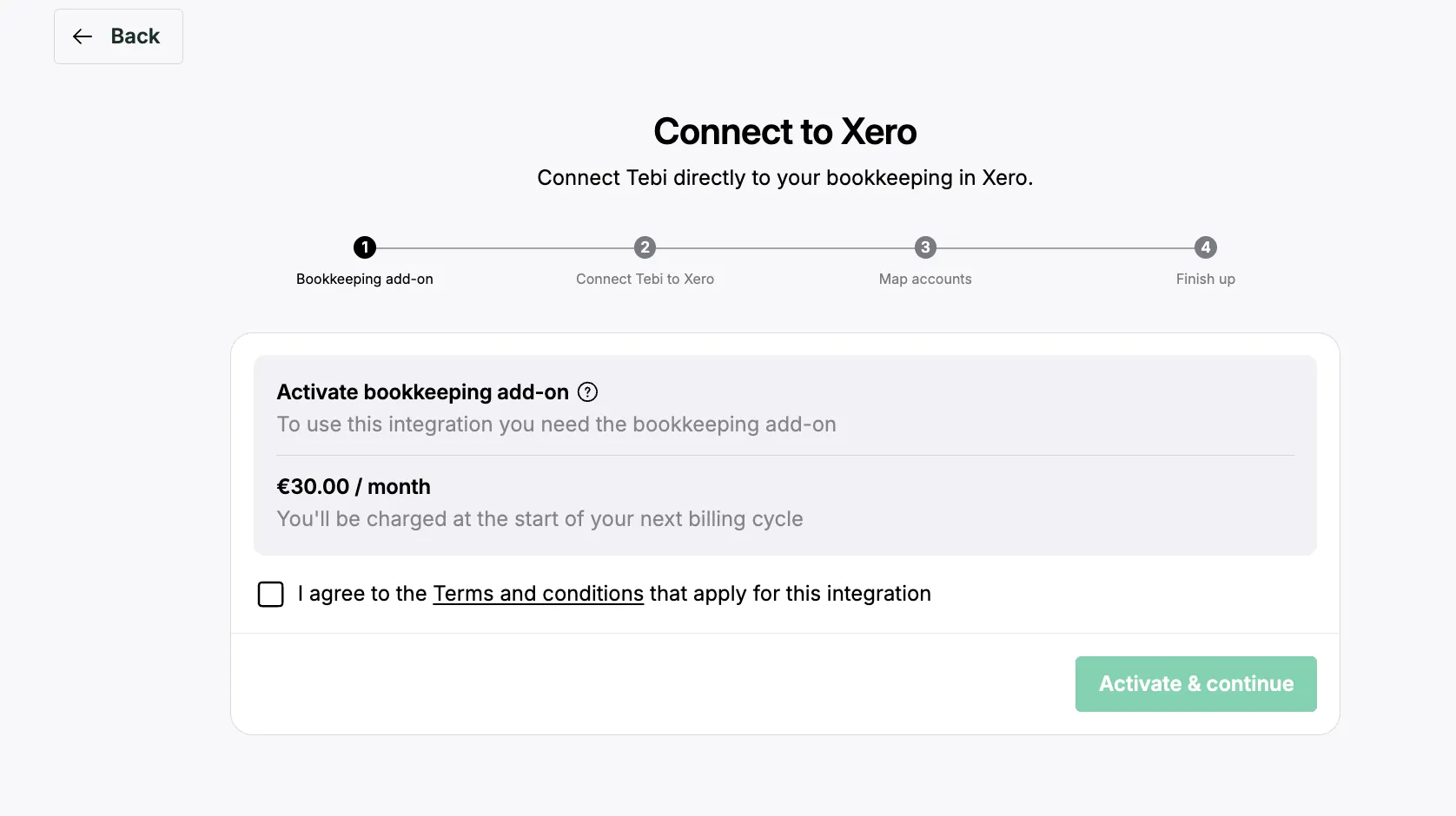 Enabling this bookkeeping add-on has an additional cost of £30/month. Please note that the billing will begin immediately after completing the steps in this guide — even if you don’t finish the setup today. You can consult our terms and conditions here and disable the add on and cancel this additional subscription cost anytime, in your integration settings.