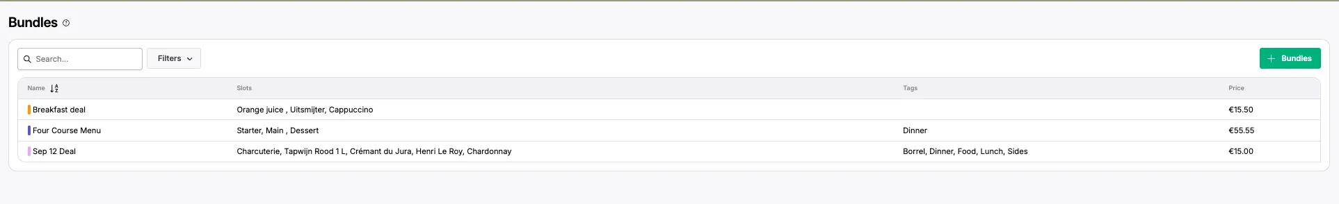 Bundles let you sell several products together as one item, for example a three-course menu, tasting flight, or package deal.