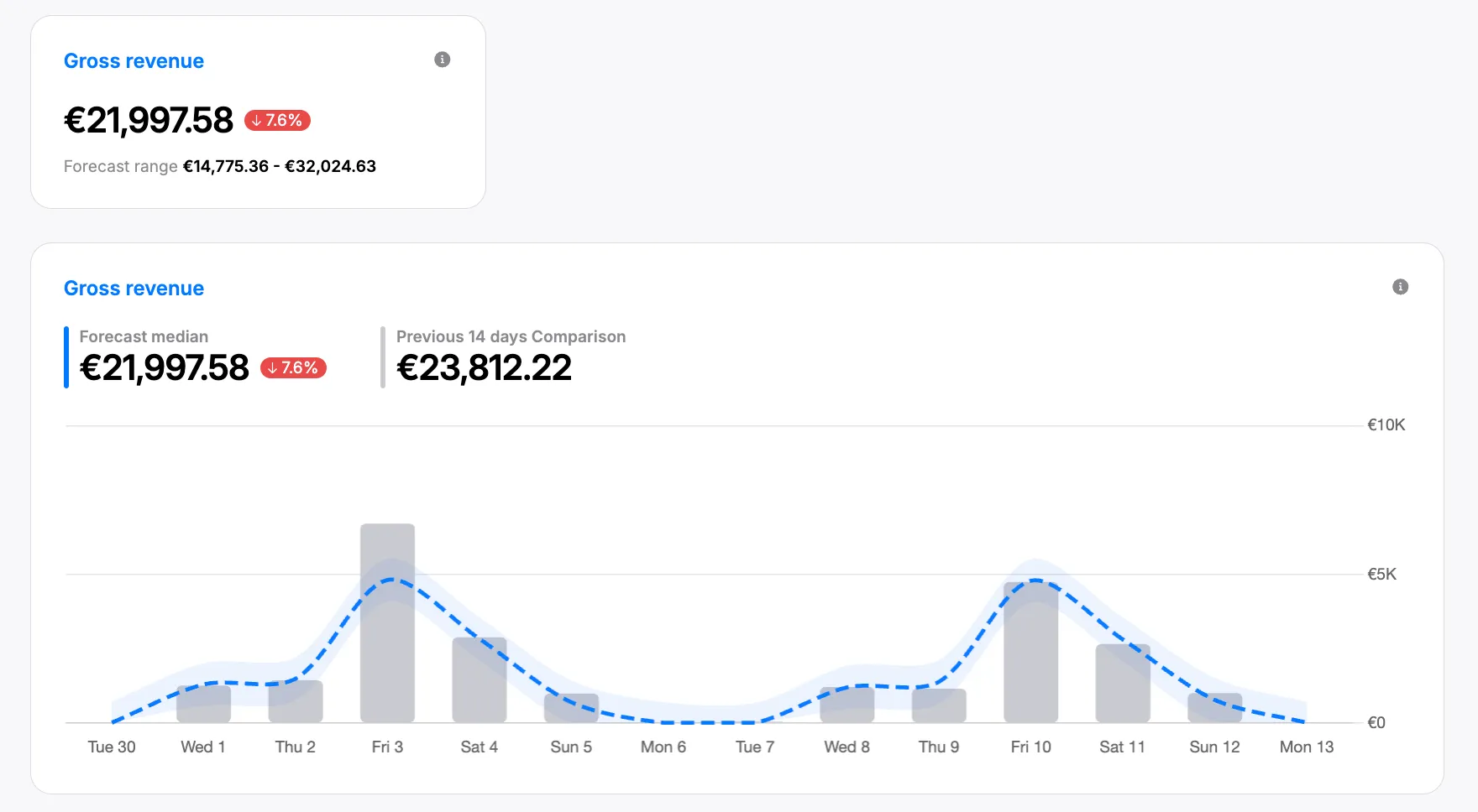 - The grey bars in the chart show the revenue of the previous numbers of days selected to compare the forecast against.